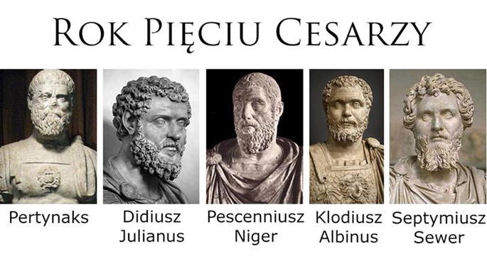 -Dydiusz Julianus (28 marca – 1 czerwca 193 n.e.), który wygrał licytację o tron zorganizowaną przez straż pretorianów. Jego rządy były niepopularne wśród armii i ludności Rzymu. Został uznany za uzurpatora przez innych pretendentów do tronu i stracony po dwóch miesiącach.