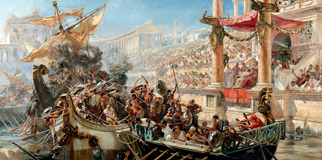 – W Koloseum mogły odbywać się inscenizacje bitew morskich, zwane naumachiami, ale kwestia ta budzi pewne kontrowersje wśród historyków. Naumachie były organizowane na specjalnie zalanych arenach, na których budowano okręty, a uczestnicy (często więźniowie lub skazani) odgrywali bitwy, zazwyczaj kończące się ich śmiercią. Pierwsze naumachie prawdopodobnie odbyły się podczas rządów Juliusza Cezara w 46 roku p.n.e. na zalanym terenie w pobliżu Tybru. Cesarz August również zorganizował naumachię, wykorzystując sztuczne jezioro. Neron i Domicjan kontynuowali tę tradycję, budując specjalne baseny na inscenizacje. Koloseum (Amfiteatr Flawiuszów) zostało otwarte w 80 roku n.e. za panowania cesarza Tytusa. Według niektórych źródeł starożytnych, arena była początkowo przystosowana do zalewania wodą w celu organizacji bitew morskich. Prawdopodobnie system kanałów i zbiorników wodnych mógł umożliwiać zalanie areny (w trakcie badań archeologicznych odkryto podziemne struktury Koloseum, które mogły być pierwotnie zaprojektowane do odprowadzania i wprowadzania wody na arenę). Jednak korytarze te zwane hypogeum, wypełnione były pomieszczeniami dla zwierząt i mechanizmami, co uczyniło organizowanie naumachii technicznie niemożliwym.